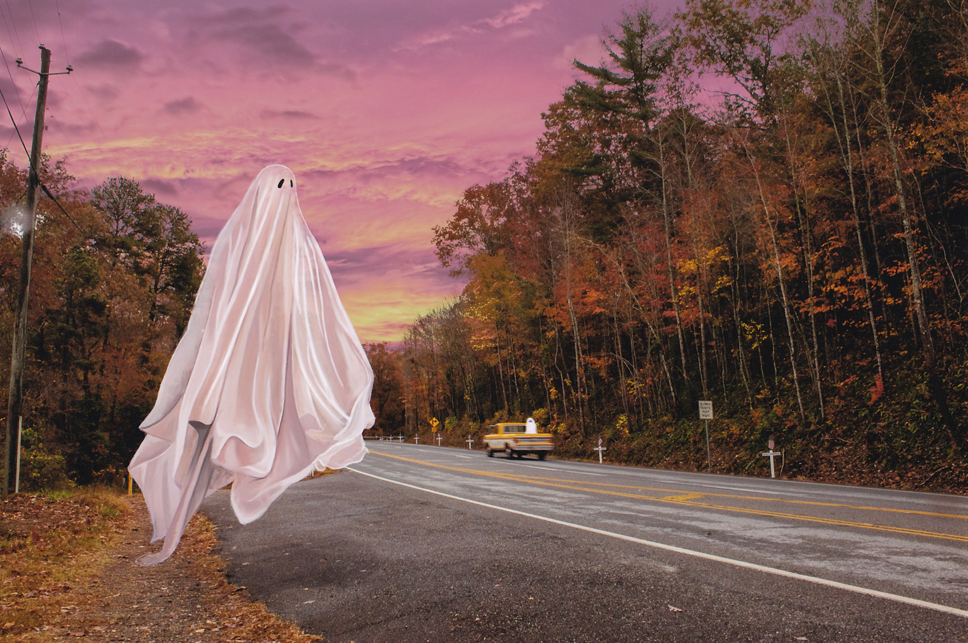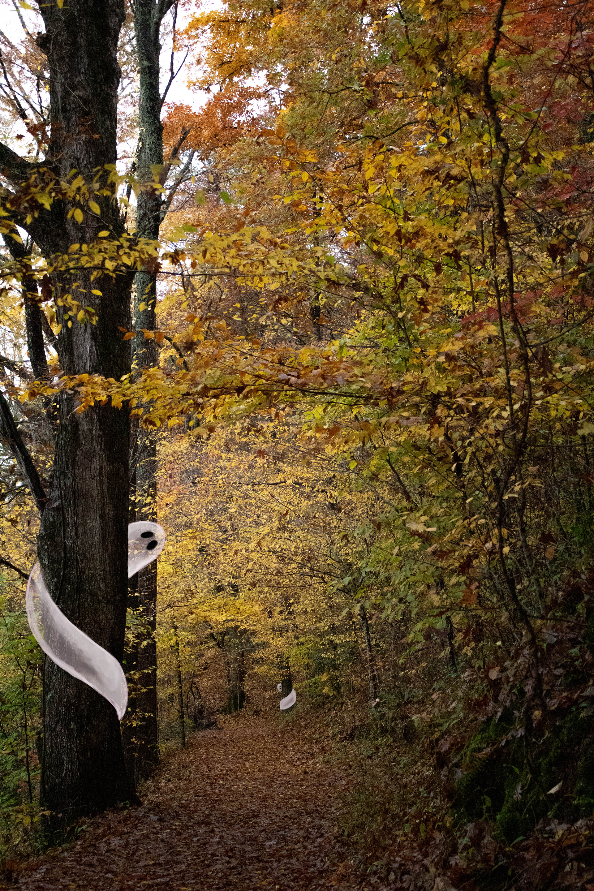 This photo series follows a wanderer’s journey through a quiet forest where unexpected ghostly encounters unfold. What begins as a simple walk transforms into a surreal narrative: first met by veiled spirits, then led deeper by phantom paw prints. The story ends with the discovery of a spectral cat, closing the loop of a soft, haunting tale set in the hush of autumn.